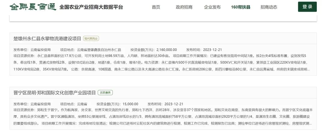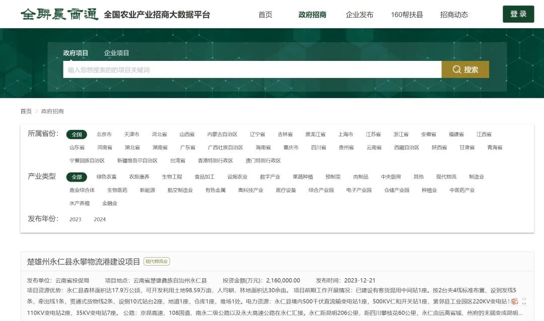 该栏目以县域政府为单位,发布各地农业相关的招商引资优质项目。