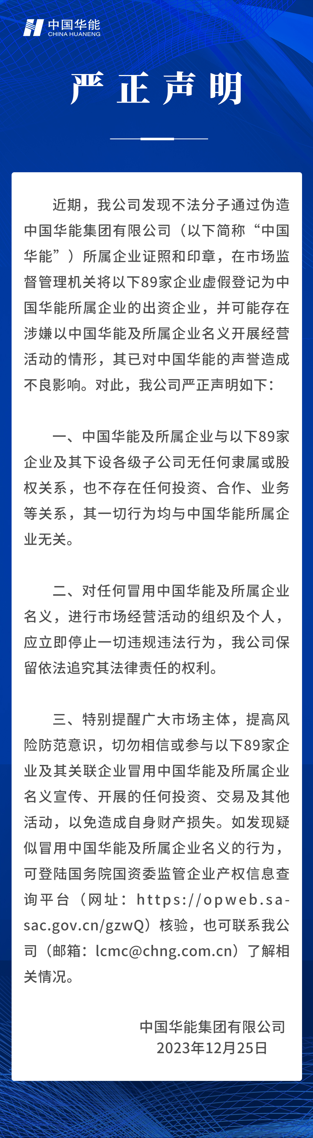 严正声明!华能集团打假89家虚假登记企业(附名单)