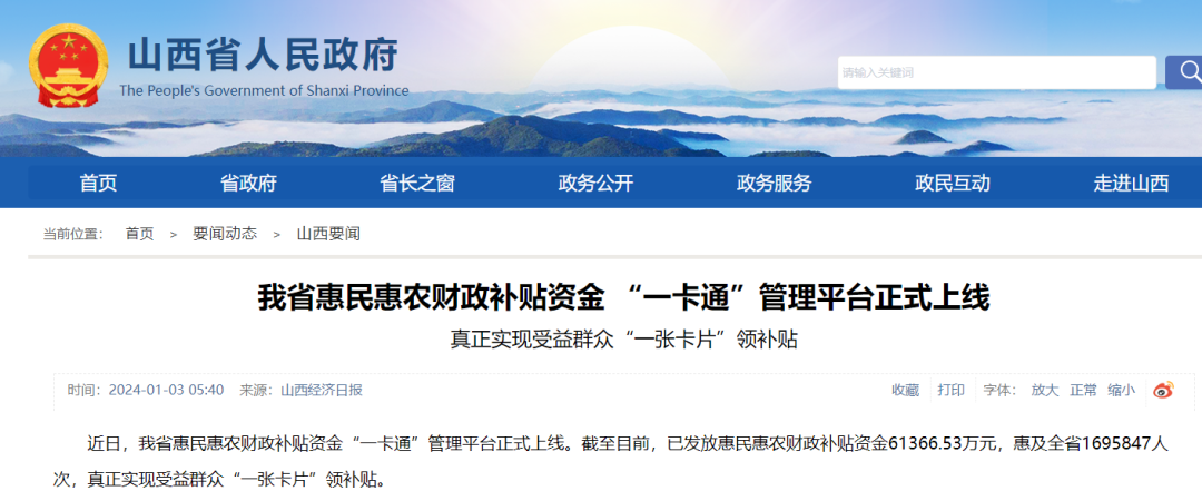 近日,山西省惠民惠农财政补贴资金“一卡通”管理平台正式上线。截至目前,已发放惠民惠农财政补贴资金61366.53万元,惠及全省1695847人次,真正实现受益群众“一张卡片”领补贴。