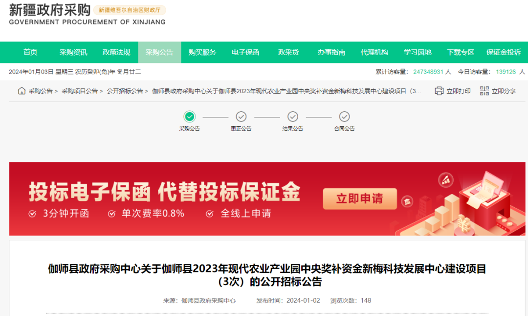 伽师县政府采购中心关于伽师县2023年现代农业产业园中央奖补资金新梅科技发展中心建设项目(3次)的公开招标公告