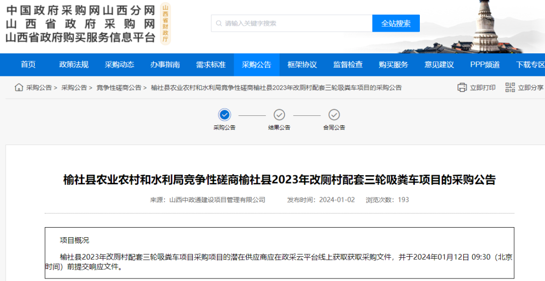 榆社县2023年改厕村配套三轮吸粪车项目采购项目的潜在供应商应在政采云平台线上获取获取采购文件,并于2024年01月12日 09:30(北京时间)前提交响应文件。