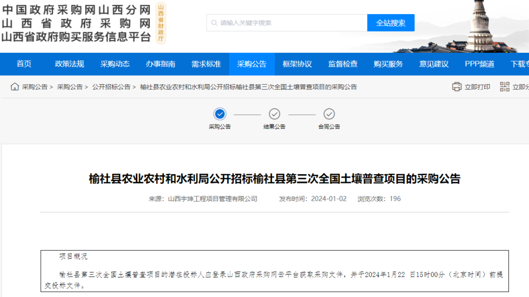 榆社县第三次全国土壤普查项目的潜在投标人应登录山西政府采购网云平台获取采购文件,并于2024年1月22 日15时00分(北京时间)前提交投标文件。