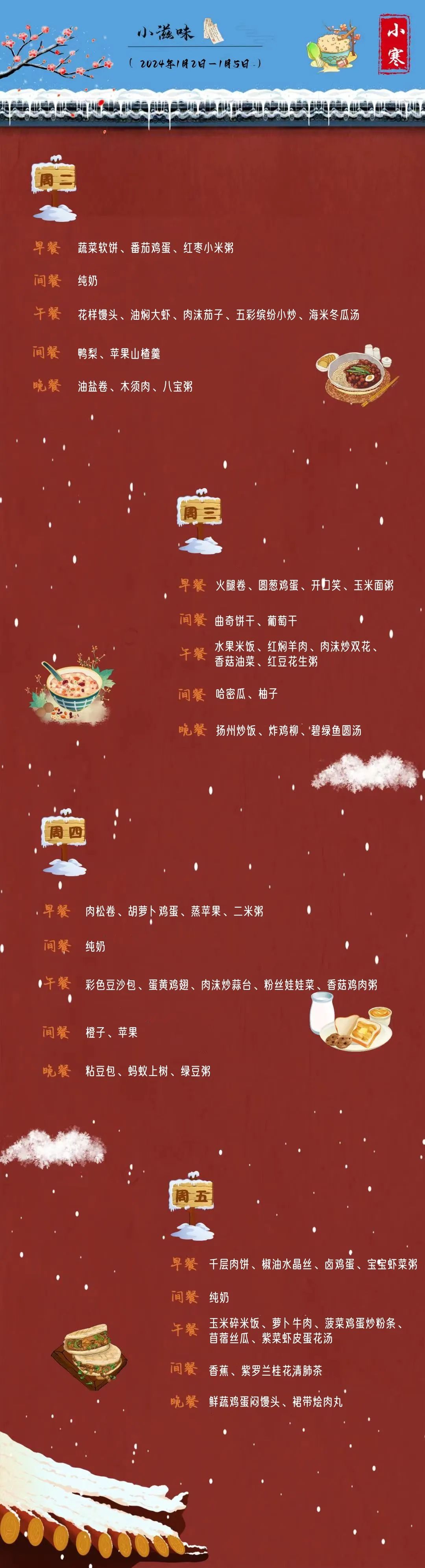 食暖科幼,周食四季。一周的食谱等你慢慢去品尝,小寒节气食谱新鲜呈上,在本周五前和宝贝投票选出最爱的科幼美食吧!在下期小滋味栏目里,小编会附赠烹饪方法呦~