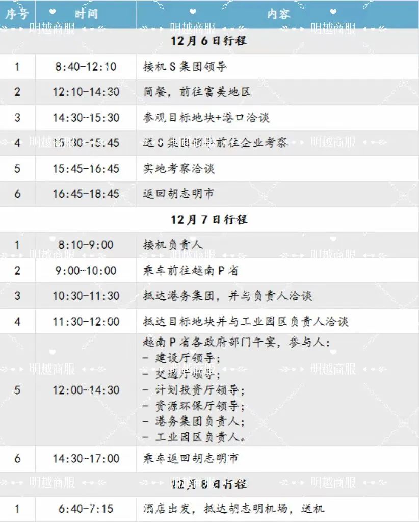 根据考察团人员级别和时间,明越商服提前做好精准规划: