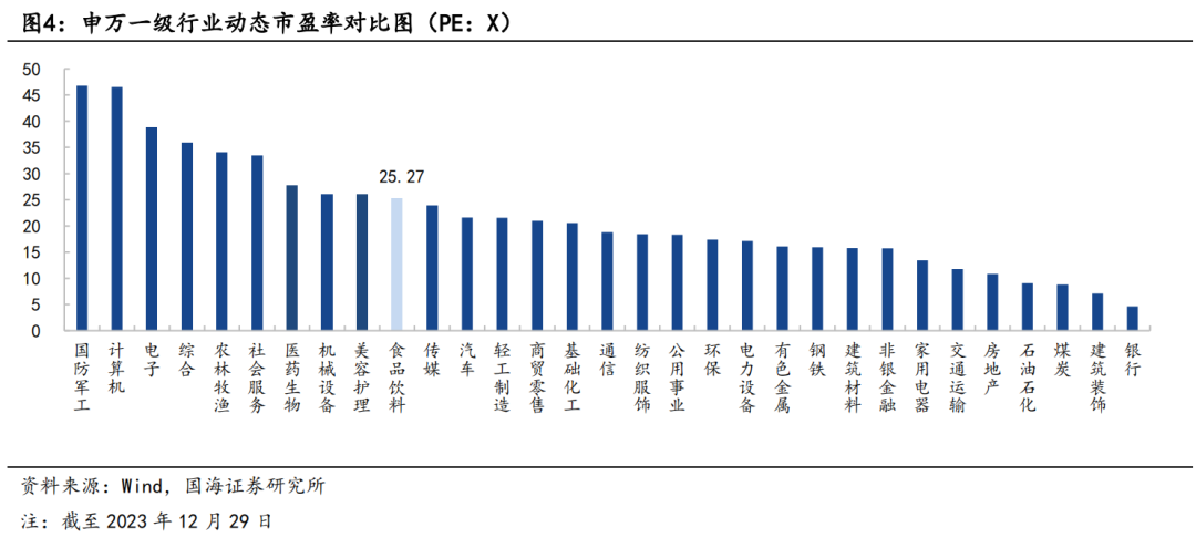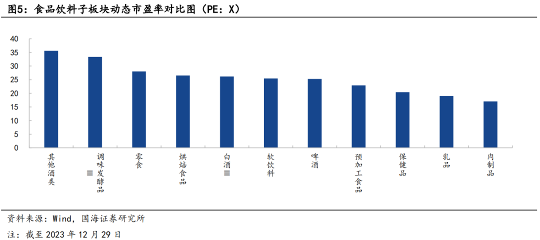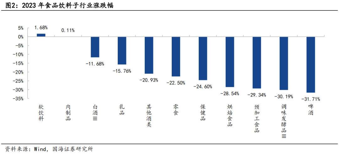 1、全年收官,2023年板块涨幅排名中下游,连续第三年消化估值。2023年食品饮料跌幅14.94%,跑输上证综指(-3.70%)11.24个百分点,在所有一级行业中排名倒数第八。各细分行业中只有软饮料和肉制品上涨,涨幅分别为+1.68%和+0.11%。白酒板块涨跌幅度排名第三,为-11.68%。个股方面,小市值个股涨幅靠前,莲花健康(+123.25%)、惠发食品(+94.61%)、*ST西发(+73.89%)、威龙股份(+66.06%)、泉阳泉(+54.28%)等领涨;绝味食品(-55.83%)、妙可蓝多(-49.53%)、立高食品(-49.19%)、重庆啤酒(-46.47%)、酒鬼酒(-46.29%)领跌。在经历了2016~2020阶段的趋势性上涨后,当前食品饮料板块已经历了3年左右的估值消化期。我们认为板块持续回调主要由于市场对于宏观经济的过度担忧,消费端弱复苏,以及外资流出等流动性原因。