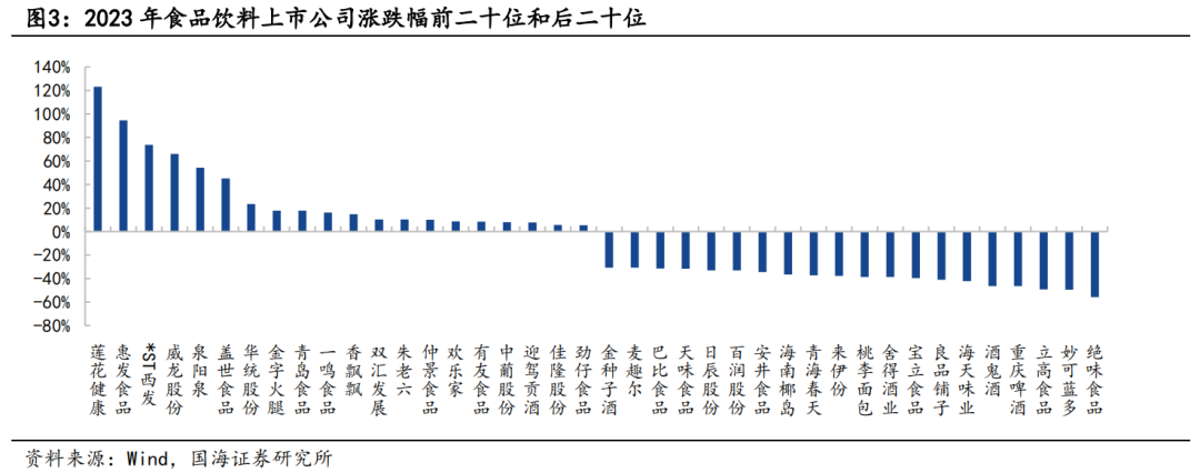 3、大众品:全年看大众品表现承压,估值下探。从全年大众品子版块涨跌幅看,软饮料(+1.68%)和肉制品(+0.11%)涨幅靠前,啤酒(-31.71%)、调味品(-30.19%)、预加工食品(-29.34%)领跌。软饮料主要受益于2023年户外、旅行等场景的快速恢复,高股息个股如养元饮品、元祖股份、承德露露、有友食品、双汇发展均在2023年跑出较为明显的超额收益。2023年餐饮端弱复苏,C端居家消费占比高的个股面临高基数压力,渠道的分化叠加竞争的加剧使得调味品、预加工食品相关龙头个股表现承压。性价比消费当道,居民消费更加理性,客单价相对较高、偏可选属性的个股如绝味食品、妙可蓝多修复有所承压。总结来看,提升供应链效率、积极进行产品创新是当前需求弱复苏、竞争加剧背景下的破局之道。相对来说,小企业更具创新环境,新品、新渠道带动的增量弹性更大,低估值/高分红/低位稳固的行业龙头也有望在弱势市场中跑出绝对收益。从估值角度看,多数大众品标杆企业估值分位数已经至20%以下,我们认为短期的悲观预期已经反应在股价里,长期看性价比凸显。建议两条选股思路:1)成长方向:2024年收入增速有望达到20%+,估值切换后回报空间具备吸引力,如百润股份、安井食品、甘源食品、盐津食品、劲仔食品、千味央厨、东鹏饮料;2)稳健+高分红:基本面有边际改善趋势的个股,如伊利股份、安琪酵母、洽洽食品、元祖股份。