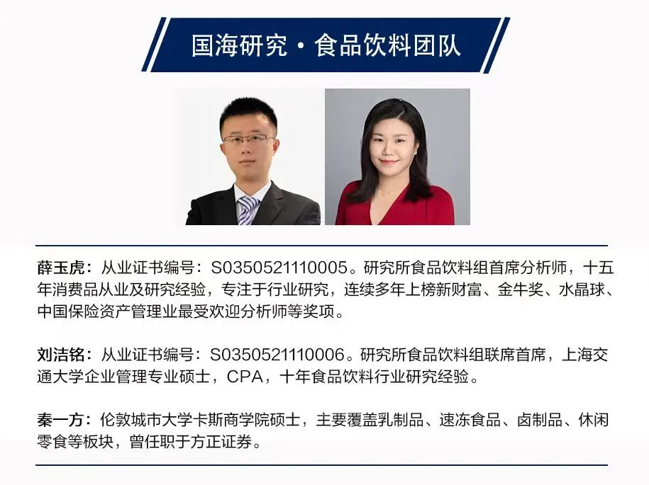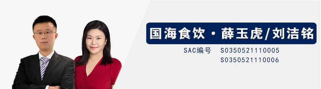 6、风险提示:1)餐饮渠道恢复低于预期;2)宏观经济波动导致消费升级速度受阻;3)行业政策变化导致竞争加剧;4)原材料价格大幅上涨;5)重点关注公司业绩或不及预期;6)食品安全事件等。