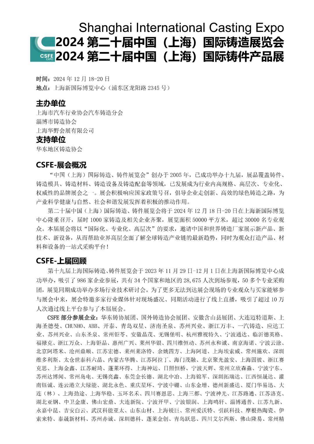 需要参展的企业可以先点击连接2024第二十届中国(上海)国际铸造展览会展位申请表,等展位确定好后直接将参展申请表打印出来填写好盖章回传到主办单位,主办单位收到申请表后也会尽快上报公司帮您把展位确定下来,谢谢!