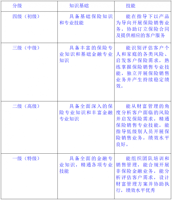 按照新标准,拟将个人保险代理人划分为四个等级,分别是:四级(初级)、三级(中级)、二级(高级)、一级(特级),四个级别的技能要求和相关知识要求依次递进,高级别涵盖低级别的要求,级别鉴定包括理论知识考试、技能考核以及综合评审。
