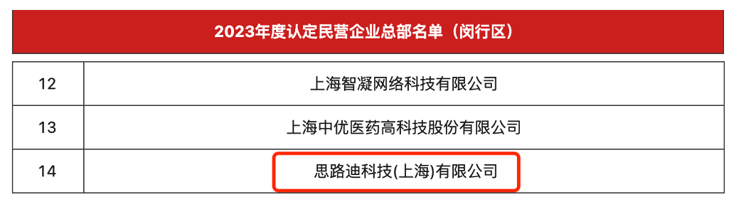 1月5日,市商务委、市工商联发布2023年度认定民营企业总部名单中,思路迪科技(上海)有限公司榜上有名。