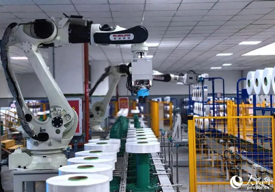 恒申集团化纤车间里的机械臂已取代人工进行批量搬运。人民网 叶青卿 摄