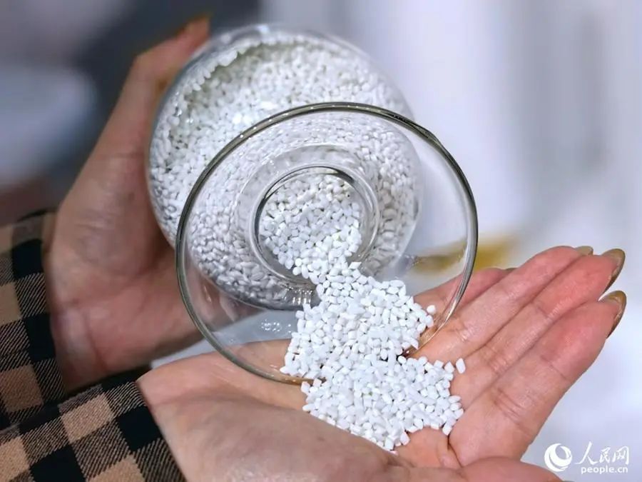 图为聚酰胺-6切片(主要原料是己内酰胺),其下游广泛应用于纺丝、工业塑料、薄膜等领域。人民网 叶青卿 摄