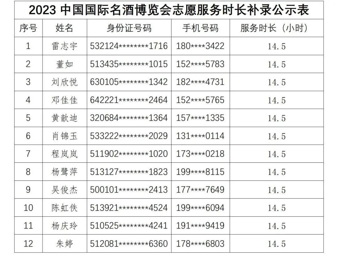 按照《“志愿四川”平台志愿服务活动发布规范(试行)》相关要求,经宜宾市青年志愿者协会秘书处审核,拟对参加“2023中国国际名酒博览会”等3个活动543名志愿者服务进行时长补录登记。