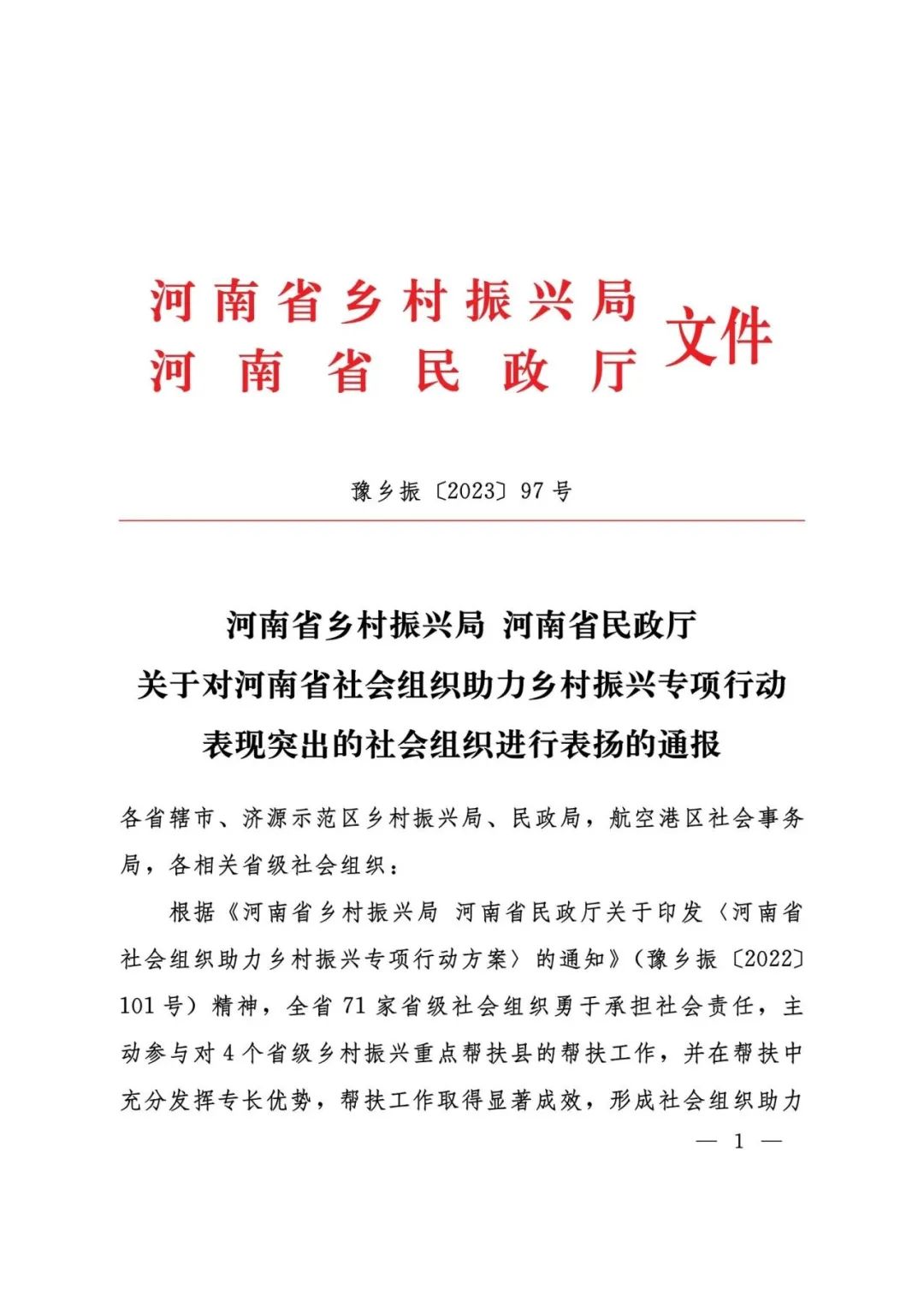 2023年12月26日,河南省乡村振兴局 河南省民政厅印发《关于对河南省社会组织助力乡村振兴专项行动表现突出的社会组织进行表扬的通报》(豫乡振〔2023〕97号)。河南省服装行业协会荣获2023年度省级社会组织助力乡村振兴专项行动先进集体。