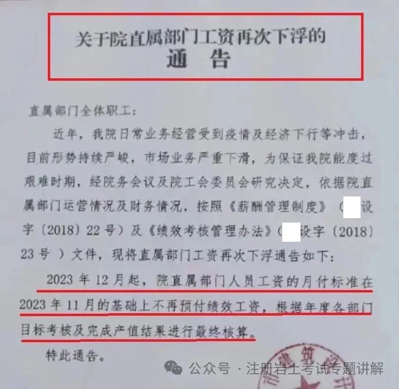 广东某市属设计院发通告,直属部门再次下浮工资,不再预付绩效工资。那么每个月只有基本工资,而年底才会进行年度各部门考核,最终进行工资核算。通告给出的理由是日常业务经营受到疫情及经济下行等冲击,目前形势持续严峻,市场业务严重下滑。目的很简单就是以牺牲员工利益保证设计院能度过艰难时期,而且是经过了院工会委员会研究决定的。不知道这设计院每月的基本工资能不能覆盖住房贷、车贷、子女教育、老人看病······