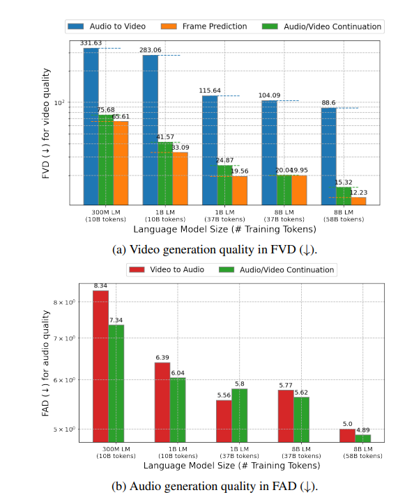 随着模型规模的增长和训练数据量的增加,性能会有所提升。Video Poet 训练了具有 3 亿、10 亿和 80 亿参数的语言模型,分别在包含 10 亿、37 亿和 58 亿视觉和视听 token 的数据集上进行训练。增加模型规模提高了时间一致性、提示保真度和运动动态性,同时增加了有限文本渲染、空间理解和计数的能力。
