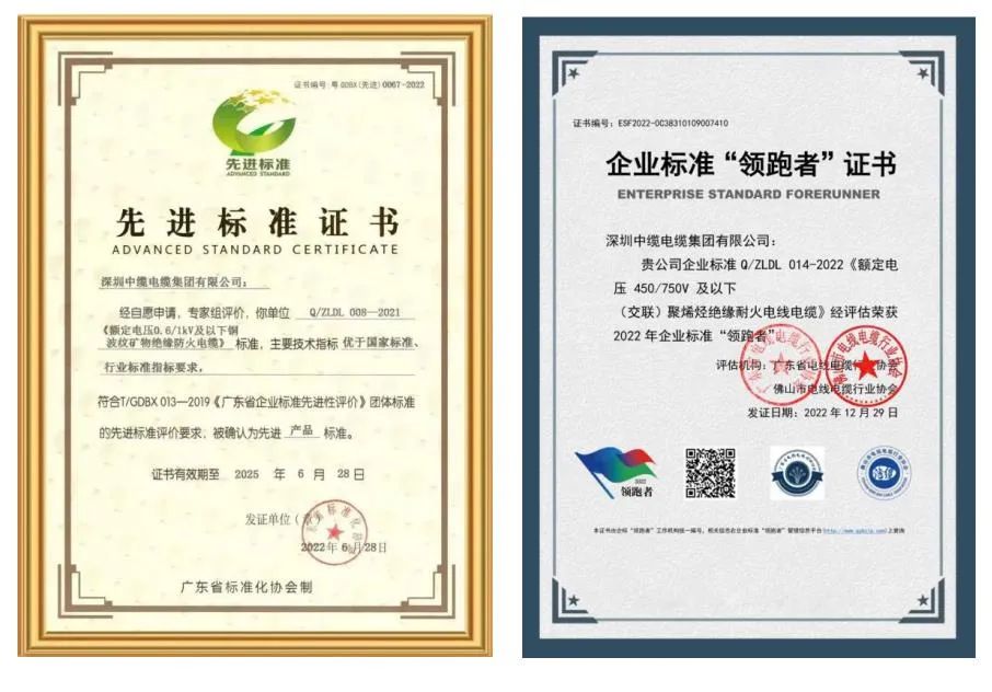 此外,中缆电缆还积极参与行业标准化建设工作,公司主导或参与制订了国家标准、行业标准、团体标准等。中缆电缆通过2022企业标准“领跑者”认证评级,荣获2022年企业标准“领跑者”证书,成为行业“领跑者”。中缆电缆的企业产品标准还被广东省标准化协会组织专家组评审为,主要技术指标优于国家标准、行业标准指标要求,被评价为广东省先进标准。