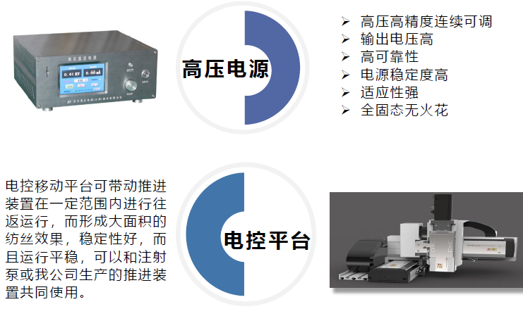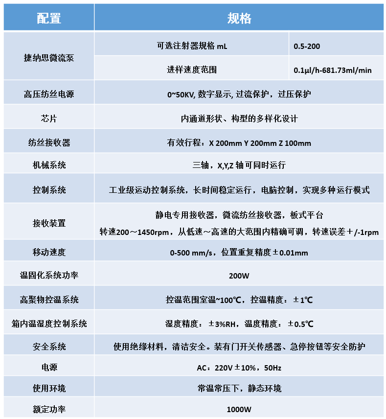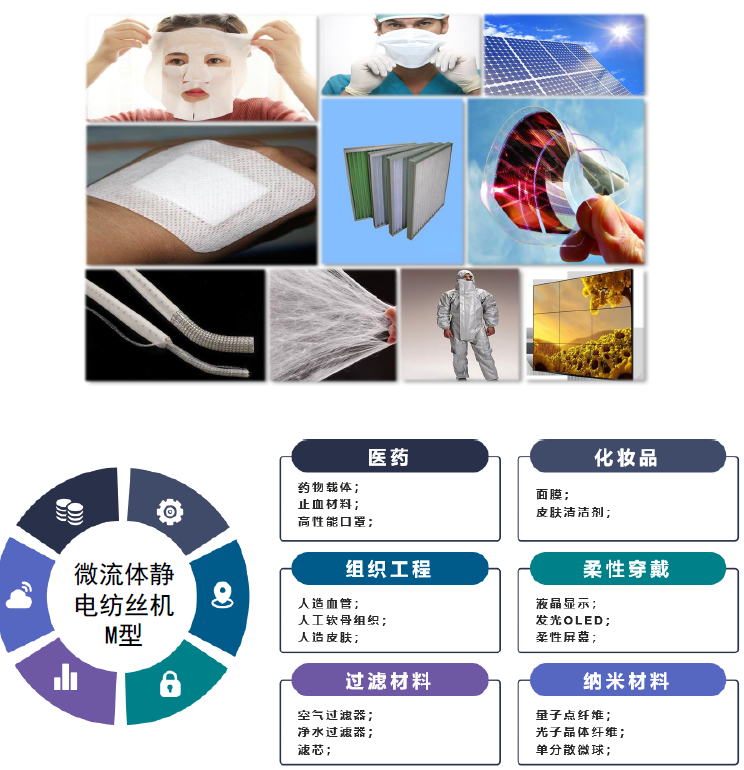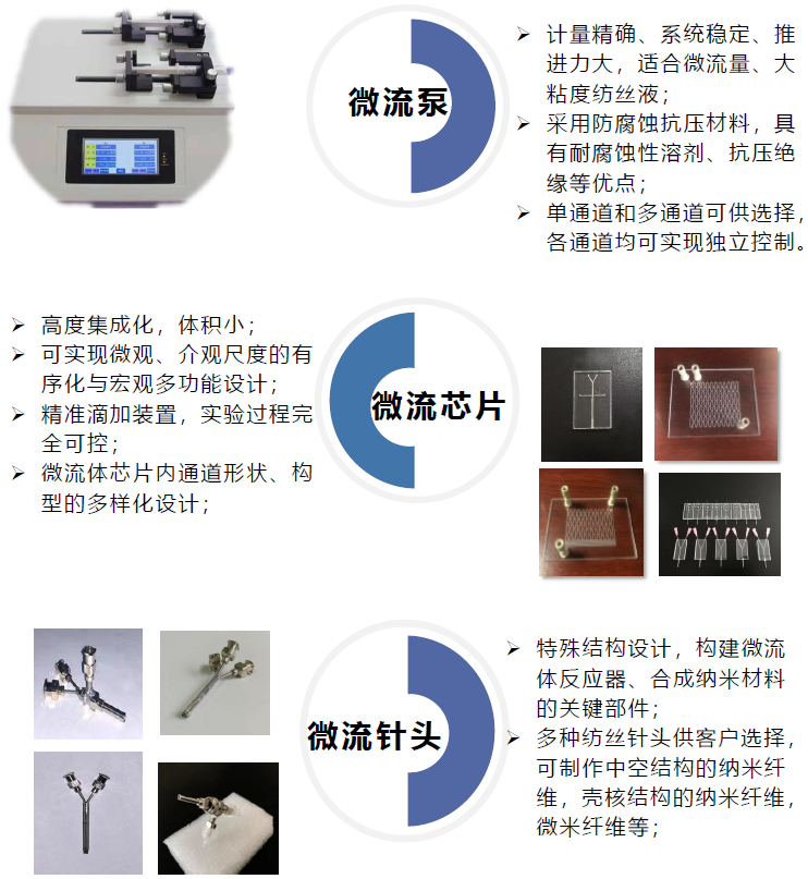 微流体静电纺丝机融合静电纺丝、微流体纺丝的原理,以多样化微流控芯片为核心,通过微流控数字化精准调控,全新设计出静电微流控一体纺丝机,既具有静电可制备超细纤维的特点,又具有微流控可制备高度有序的纤维的特点,通过微流控数字化经精准调控,实现多层次结构,多组成杂化纤维,又可以实现常规静电纺丝机制备超细化纤维的功能,从而可以实现一机多用的目的并且可以通过微流控芯片实现原位纺丝化学合成,使其纺丝过程同时具备物理和化学过程的特点。