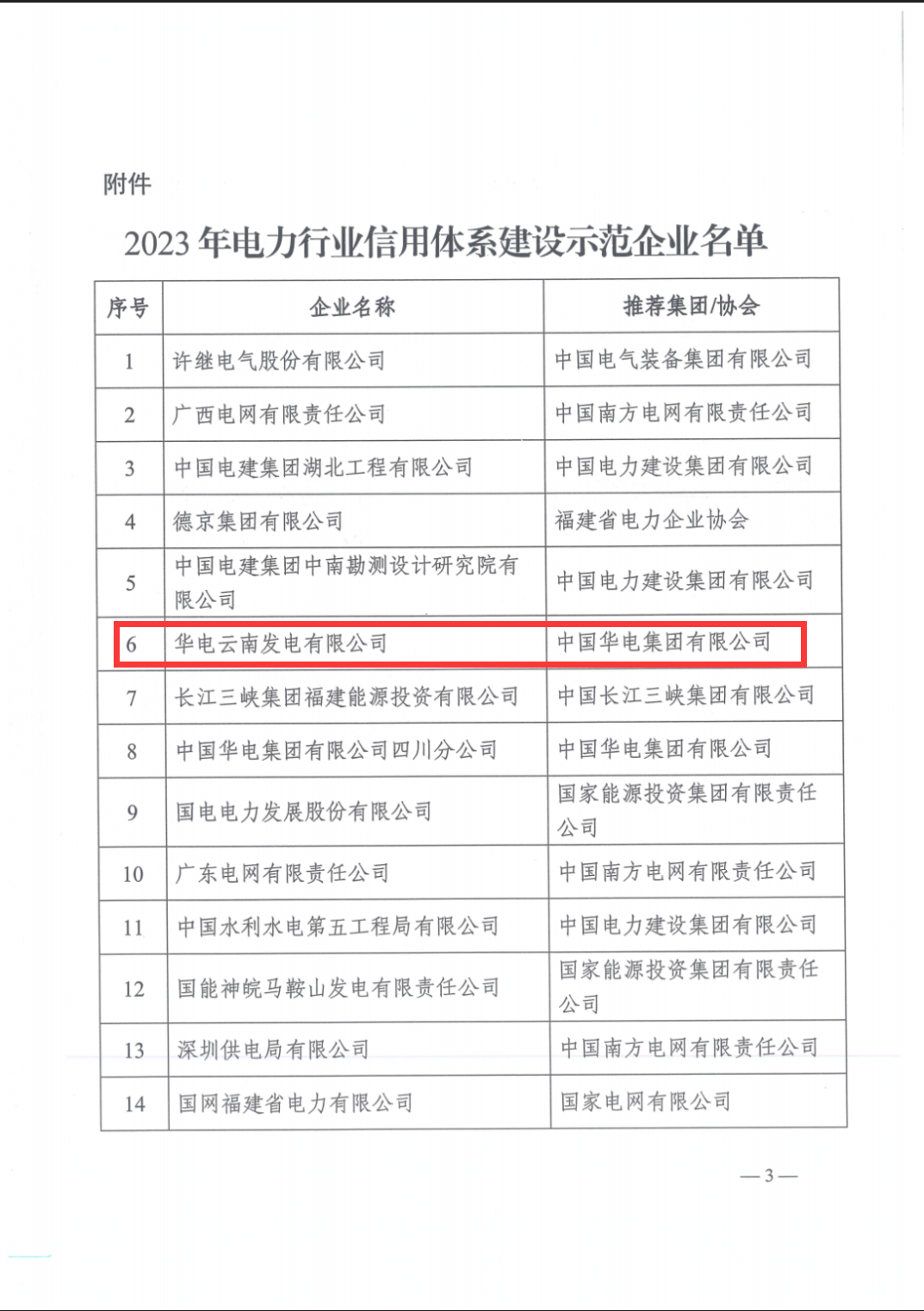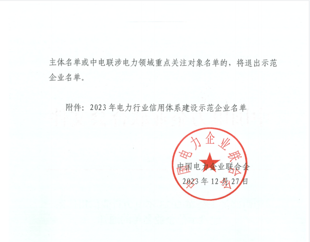 近日,中国电力企业联合会发文公布2023年电力行业信用体系建设示范企业名单,华电云南发电有限公司荣获“2023年电力行业信用体系建设示范企业”称号。