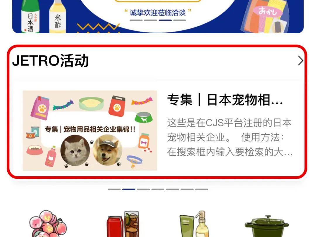 欢迎您打开 “日本商务馆”微信小程序,在【JETRO活动】下面,可以左滑找到“专集|日本宠物相关企业集锦”。