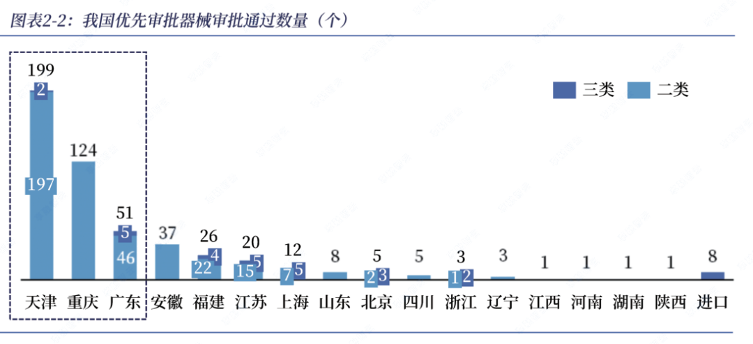 我国优先审批医疗器械产品大多为国产的二类医疗器械,集中度很高,天津、重庆遥遥领先,广东位于第三名,前三名产品数量合计374个,CR3高达74%。