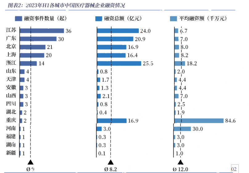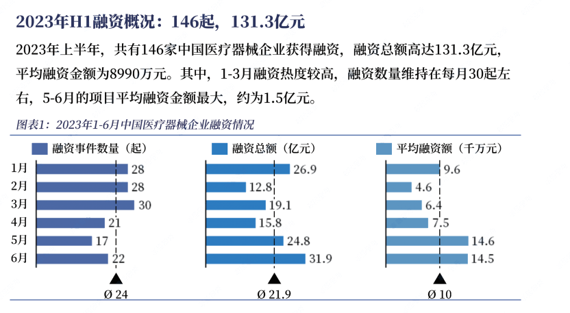 2023年上半年,我国共有146家中国医疗器械企业获得融资融资总额高达131.3亿元,平均融资金额为8990万元。江苏、广东北京、上海、浙江在融资事件数量、融资额方面均排名前列。大部分融资事件都集中在天使轮和A轮前后,B轮次之。