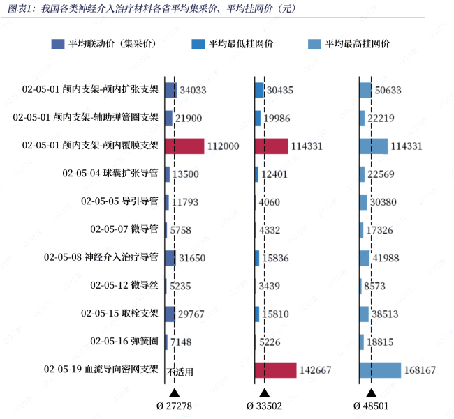 根据各省份2022年公开的招投标信息,我国神介耗材平均集采价为27278元(不含血流导向密网支架),平均最低挂网价为33502元,神介耗材仍是高值耗材中的价格高地。从品类来看,血流导向密网支架、颅内覆膜支架价格最高,单价均在10万以上;微导丝、微导管等通路内耗材相对便宜,为5000元左右。