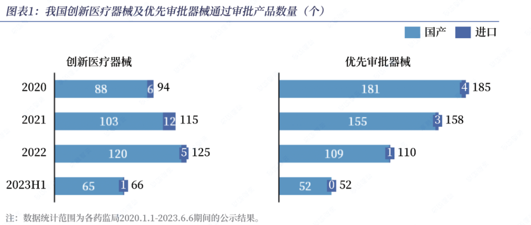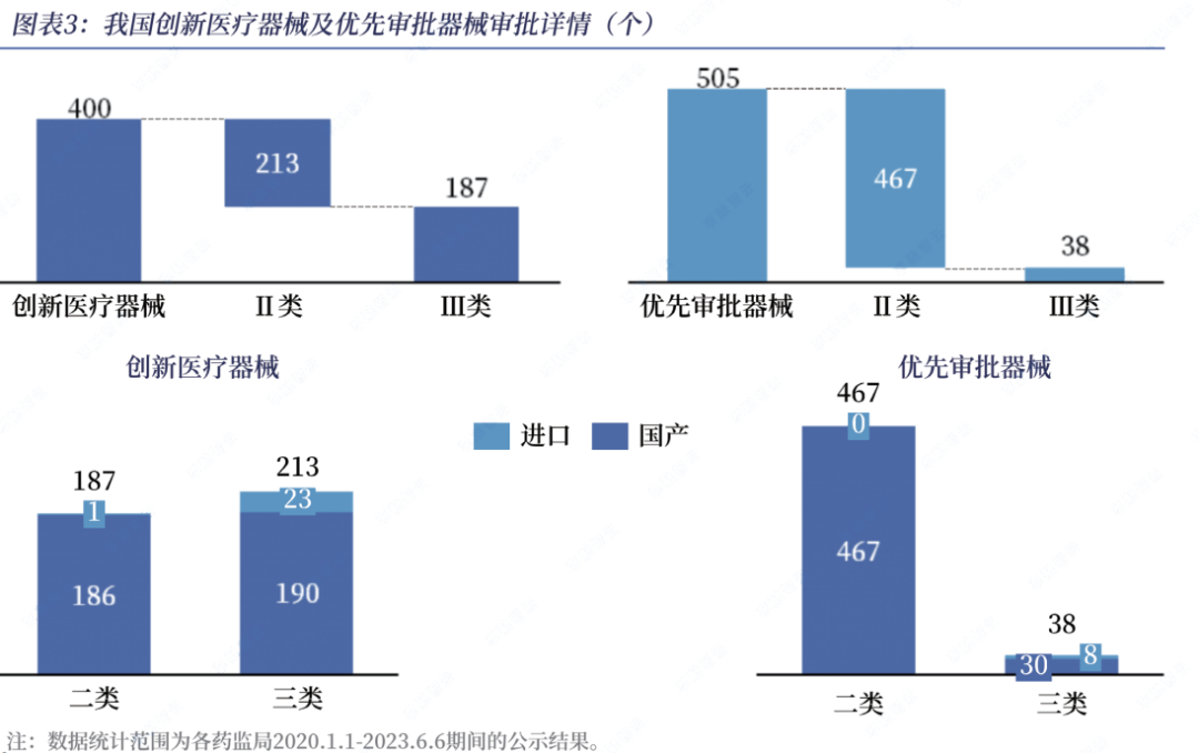 2020年1月1日至2023年6月6日,我国共审批通过了400个创新医疗器械产品,其中国产产品占比94%;通过了505个优先审批产品,其中国产产品占比98%,国产医疗器械产品结构在向高端创新化方向持续调整。