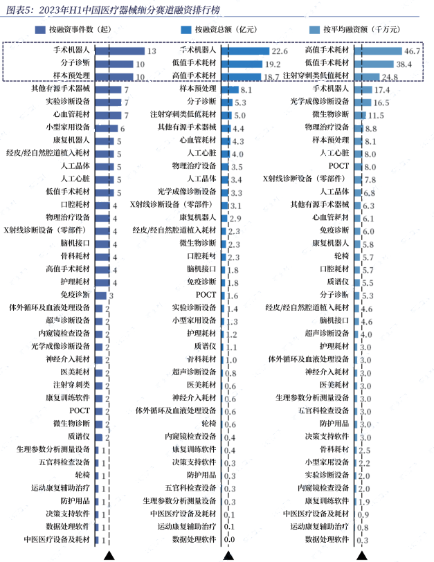 从细分赛道来看,手术机器人是最热赛道。手术机器人、分子诊断、IVD-样本预处理融资数量位列前三,手术机器人、低值手术耗材、高值手术耗材融资总额位列前三,高值手术耗材、低值手术耗材、注射穿刺类低值耗材平均融资额位列前三 。