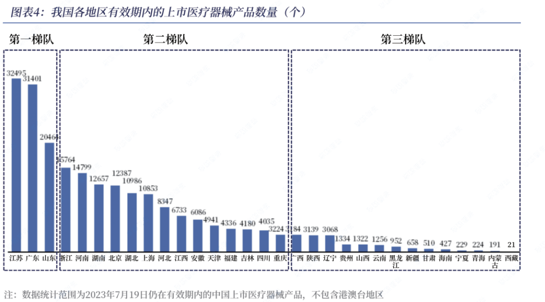 从品类来看,“低值耗材-14 注输、护理和防护器械”及“40体外诊断试剂”上市产品数量占据绝对优势。按地区划分,江苏、广东、山东批准注册产品数量位列第一梯队,江苏和广东近乎包揽了所有细分赛道的榜首位,江苏在手术器械类、植入器械类、眼科器械、呼吸麻醉和急救器械等13个细分赛道位居首位,广东在治疗设备/器械、诊断/成像设备等10个细分赛道位居第一。从企业的上市产品数量来看,波科在手术器械领域杰出,迈瑞在大型影像/监察设备领域表现优异。
