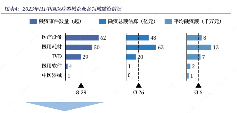 从融资领域来看,医疗设备领域融资事件最多,达62起,医用耗材融资总额和平均融资额最高,分别为62.79亿元、1.26亿元。从具体领域来看,高值耗材融资事件数及融资金额较为领先,治疗设备次之。