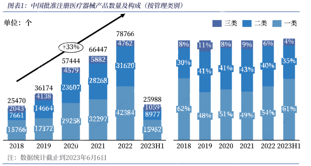 近五年,我国国家药监局批准注册的医疗器械产品数量年年攀升,2022年达78766个,年复合增速为33%,一类医疗器械数量占50%左右,三类医疗器械不到10%。我国国产产品数量占据绝对优势,一类、二类、的境内备案注册比率均已提升至98%,三类医疗器械也已提升至81%,我国高端医疗器械自主研发能力不断提升。