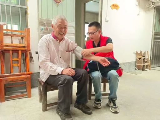 ▲远安县民政局组织社工上门为农村分散供养特困老人测量血压。