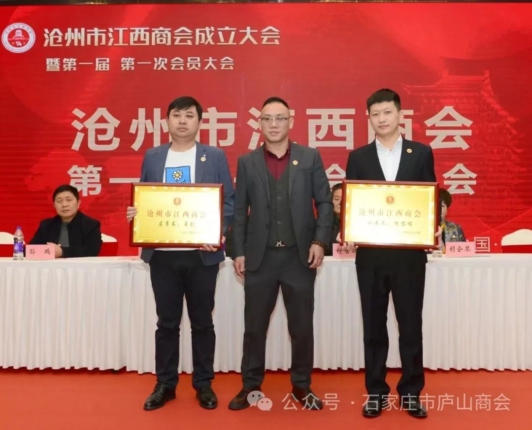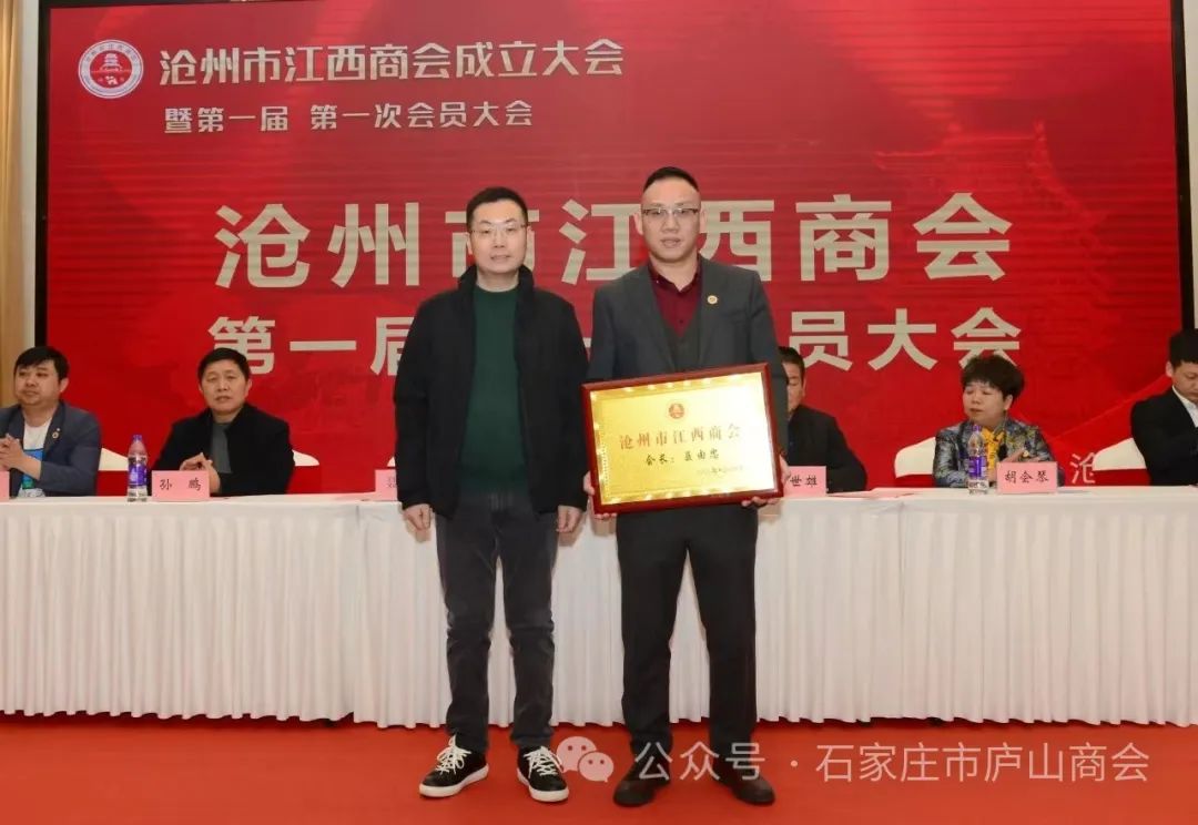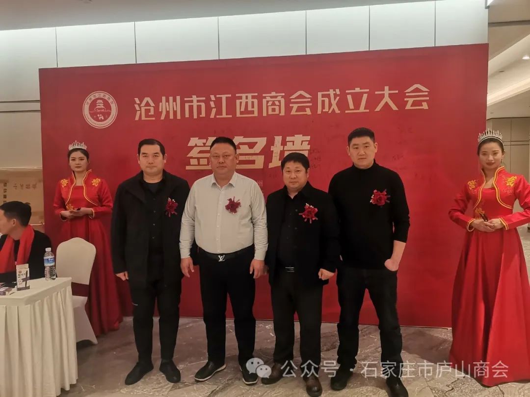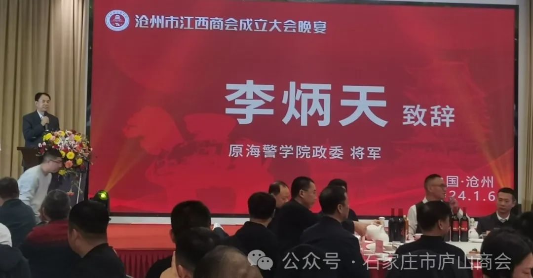 龙腾狮跃,祥瑞满堂。2024年1月6日,沧州市江西商会成立大会暨第一届第一次会员代表大会,在沧州市大运河迎宾馆隆重召开。参加会议的嘉宾有:海警学院原政委李炳天将军,沧州市统战部副部长、工商联党组书记李卫东,沧州市工商联副主席赵国政、秘书长张彦斌,沧州市民政局副局长张文华,东塑集团创始人、党委委员于桂亭,河北省江西商会会长方卫、执行会长付世雄、秘书长孙鹏,各兄弟商会,商会会员及来宾350余人参加,共襄盛举。石家庄市庐山商会会长杨先平,执行会长程伟林,常务副会长杨仕星,秘书长陈重华到现场祝贺!