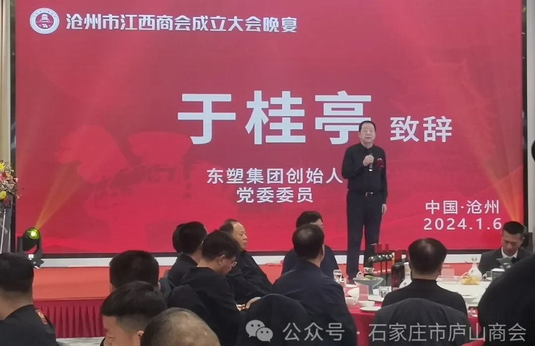 会上,河北省江西商会执行会长付世雄,东塑集团创始人、党委委员于桂亭,海警学院原政委李炳天,沧州市民政局科长巩敬杰,沧州市工商联副主席赵国政,沧州市统战部副部长、工商联党组书记李卫东等先后为庆典活动讲话。