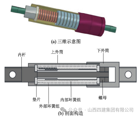 高强钢环簧自复位阻尼器自复位耗能支撑主要参与耗能并提供恢复力,结构体系可以实现自复位,阻尼器震后免更换。在超预期震动作用下,结构层间位移超过目标位移时,自复位耗能支撑内环簧之间顶紧,结构抗侧能力进一步提高,实现了结构在极罕遇地震下的安全性。