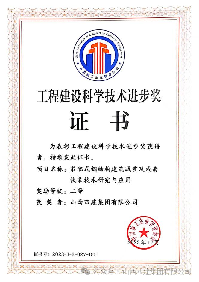 近日,中国施工企业管理协会在北京举行2023年工程建设科学技术奖颁奖典礼,全国共有1000余项成果报名参评,评选出科技进步奖375项,山西省共有6项成果入选。山西四建集团《装配式钢结构建筑减震及成套快装技术研究与应用》科技成果荣获二等奖。