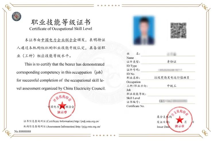 完成培训班课程学习并通过考核后,颁发北极星学社“结业证书 ”,经考核合格可获得中国电力企业联合会颁发的《垃圾焚烧发电运行值班员 (中级)》职业能力证书,表明持证人具备该职业(工种)相应技能等级水平。官网可查!