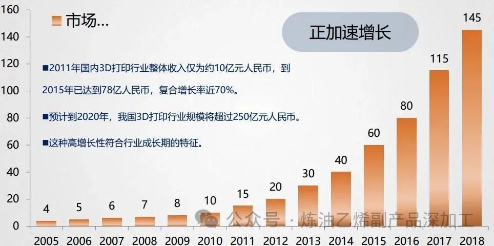 工业领域未来大规模工业应用在全球3D打印市场有望迎来爆发式增长。在工业级领域,3D打印经过30年的发展,已经形成了一条完整的产业链。目前3D打印技术已经在军事、航空航天、医疗、汽车、机械设备制造及消费领域得到了一定的应用。3D打印应用于建筑,建筑承重件,汽车零部件,工业零件。产业链的每个环节都聚集了一批领先企业。