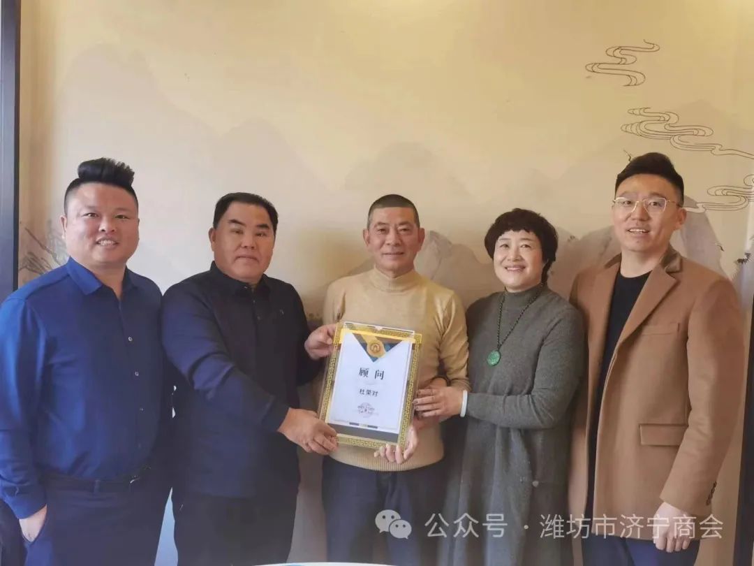 商会顾问尚继辈,向杜荣对颁发了潍坊市济宁商会顾问聘书,常务会长孔繁超把济宁商会的慰问信交给老乡杜荣对,看完慰问信,荣对老乡亲切说到:“离开老家这么多年,在潍坊收到这么多老乡的祝福,内心倍感温暖,倍受感动”。荣对老乡也衷心的祝福老乡们工作顺利,生活幸福,祝济宁商会越办越好。