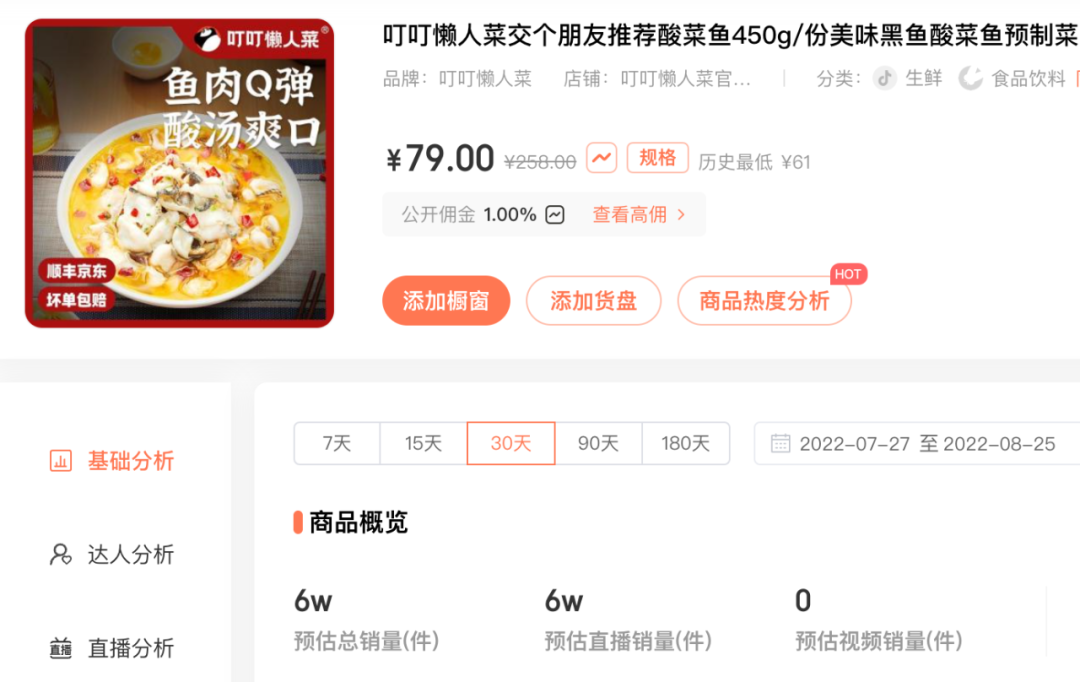 蝉妈妈数据显示,抖音平台近30天内,叮叮懒人菜标价79元的酸菜鱼(450g)预估卖出了6万件,聪厨标价49.9元的梅菜扣肉(350g*2盒)预估售出3.9万件。与之对比,海底捞主打的自热米饭、自热火锅等速食产品销量最高也只有5000余件,贾国龙功夫菜的单品销量至高仅为60余件。而在天猫平台上,叮叮懒人菜同款酸菜鱼月销量为3000件,聪厨同款梅菜扣肉月销量达到4000件,同样与西贝、海底捞形成鲜明对比。