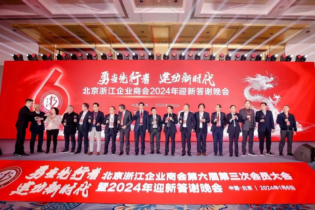 浙江省委省政府对这次会议非常重视,委派有关领导亲临现场祝贺并作重要讲话。浙江省政府驻京办党组书记、主任毛瑞福和北京市工商联副主席李振坤、上海市浙江商会会长王均金代表指导单位和兄弟商会,到会祝贺并作了热情洋溢的讲话,浙江省委统战部副部长、省工商联党组书记徐国龙代表省工商联授予商会2023年度“品牌商会”牌匾,喻渭蛟会长代表商会接牌。会议由轮值会长郎旺凯主持。