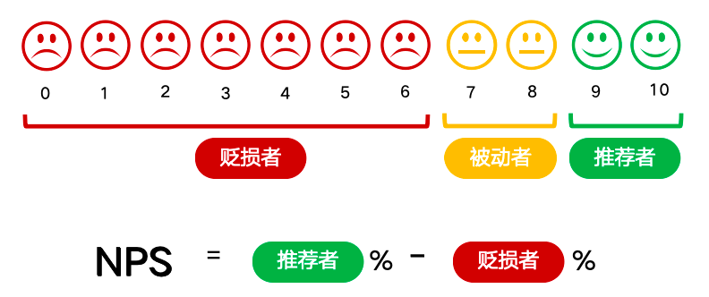 净推荐值(NPS)=(推荐者数/总样本数)×100% - (贬损者数/总样本数)×100%