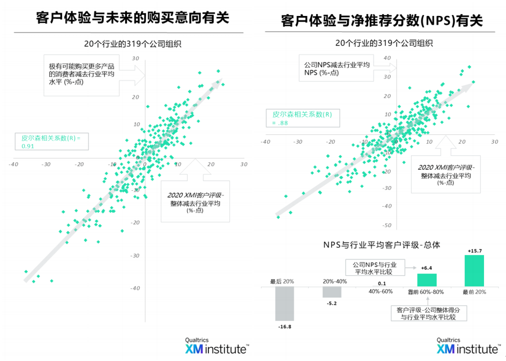 据Qualtrics发布的《客户体验的投资回报》(ROI of Customer Experience)显示,客户体验与各项忠诚度指标、重复购买指标、收入提升指标之间存在正相关关系。其中,企业客户评级得分与客户购买更多产品或服务可能性之间的正相关性系数达到0.91,充分体现了二者之间强烈的正相关性。此外,客户体验与净推荐值(NPS)的相关性系数为0.88,同样表现出较强的正相关性。