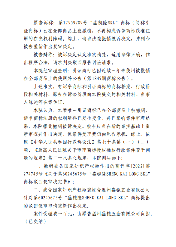 第17959789号“盛凯隆SKL”商标(简称引证商标)已在全部商品上被撤销,不再构成诉争商标获准注册的在先权利障碍。综上,请求法院撤销被诉决定,并判令被告重新作出复审决定。