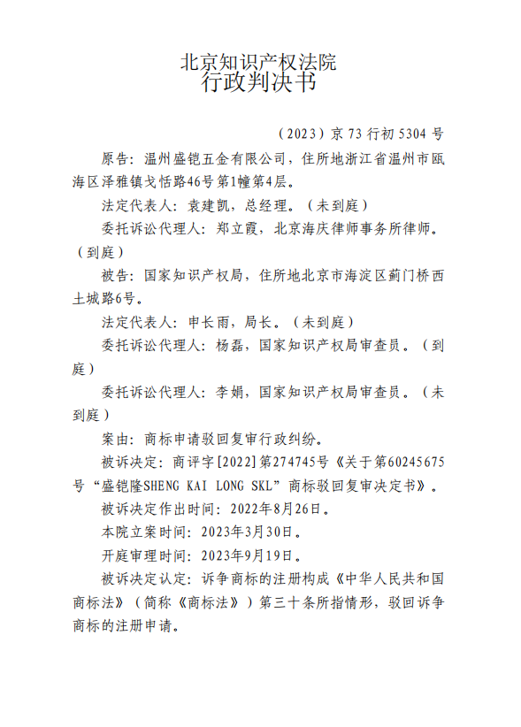 温州盛铠五金有限公司(原告)申请注册了第60245675号“盛铠隆”商标(以下简称“诉争商标”),被国家知识产权局商标局驳回,原告不服国家知识产权局商评委作出的决定,向北京知识产权法院提起驳回复审行政诉讼。