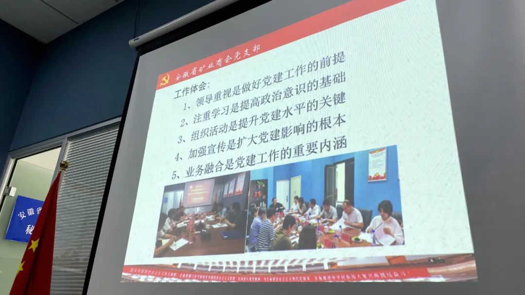 安徽省矿业商会以党建领会建,以会建促党建,支部连续获得2022年度和2023年度“全省社会组织先进党支部”荣誉称号,被省民政厅、省机关工委命名为“省级社会组织党支部标准化建设示范点”,接受过中央组织部二局、省委组织部、省非公工委和省机关工委关于社会组织党建工作的调研与指导。