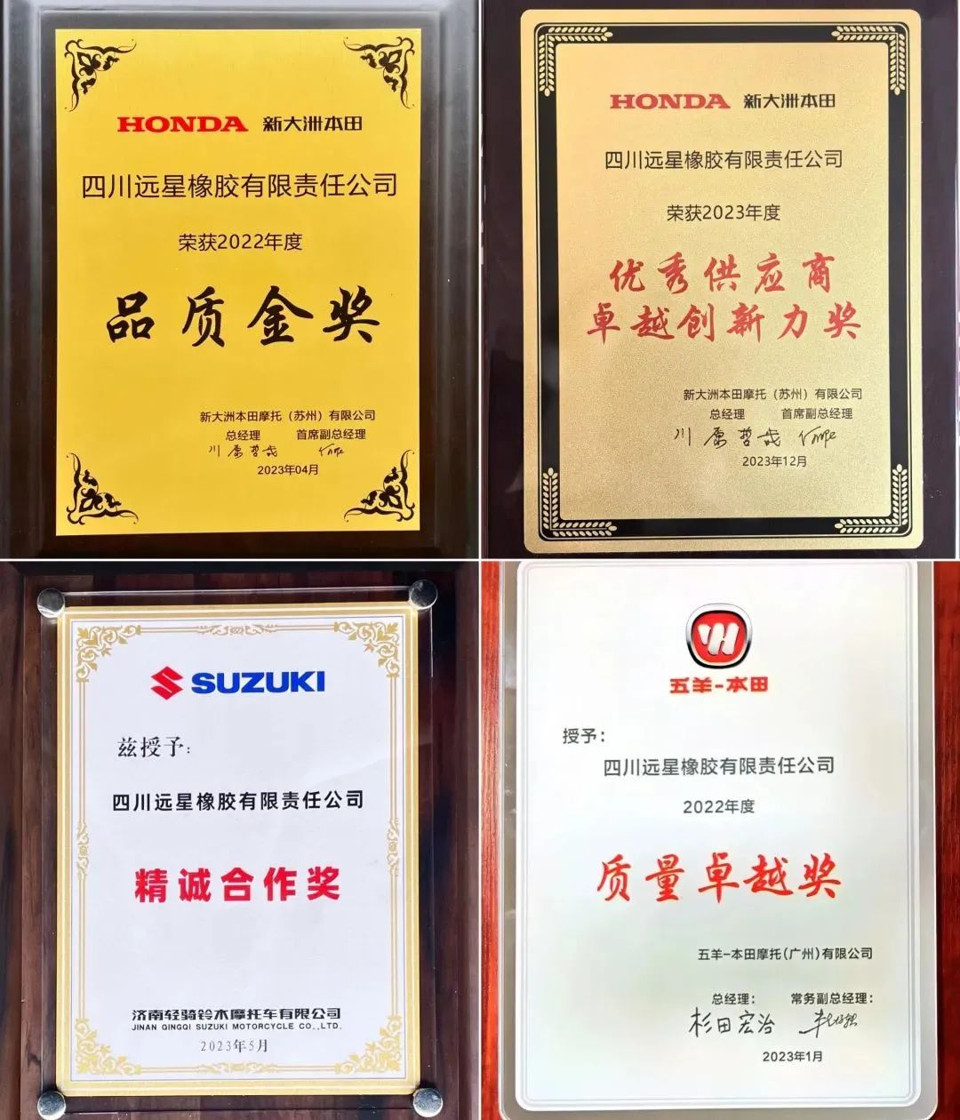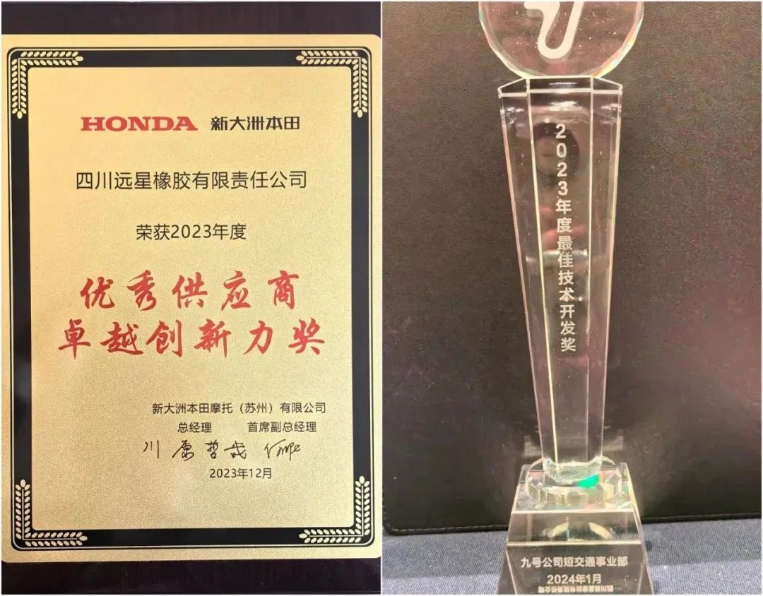 从顶级车企新大洲本田授予的2023优秀供应商“卓越创新力”奖,到本土巨头隆鑫授予的2023“优秀供应商”奖,再到此次九号公司授予的“最佳技术开发奖”。无论是摩托车企业还是电动车企业,都对远星的产品给予了高度肯定。