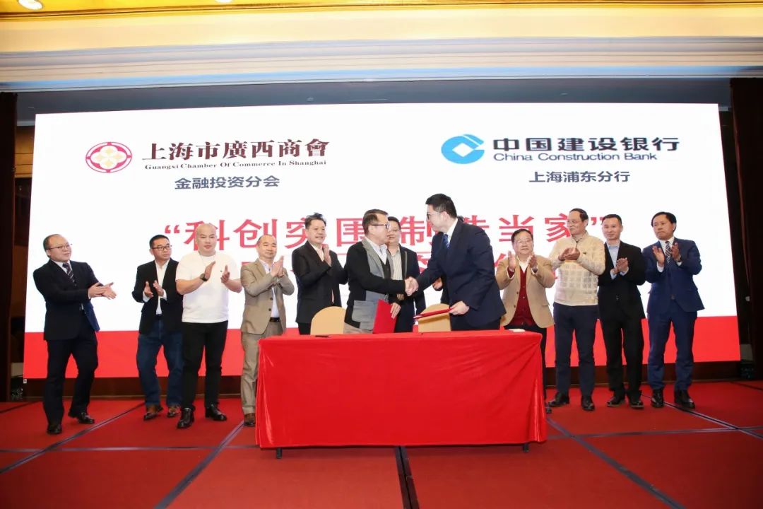 在会议的高潮环节,上海市广西商会与中国建设银行上海浦东金茂支行举行了《“科创突围 制造当家” 战略合作框架协议》签约仪式。根据框架协议,上海市广西商会将为建设银行提供会员单位的科技创新和先进制造企业集群名单和重点项目清单,建设银行将充分发挥自身作为国有大型商业银行的客户资源优势,为拟入会企业、客户提供优质金融服务。建设银行意向性承诺为会员单位提供合计不超过人民币10亿元的流动资金贷款、小微快贷等授信额度。