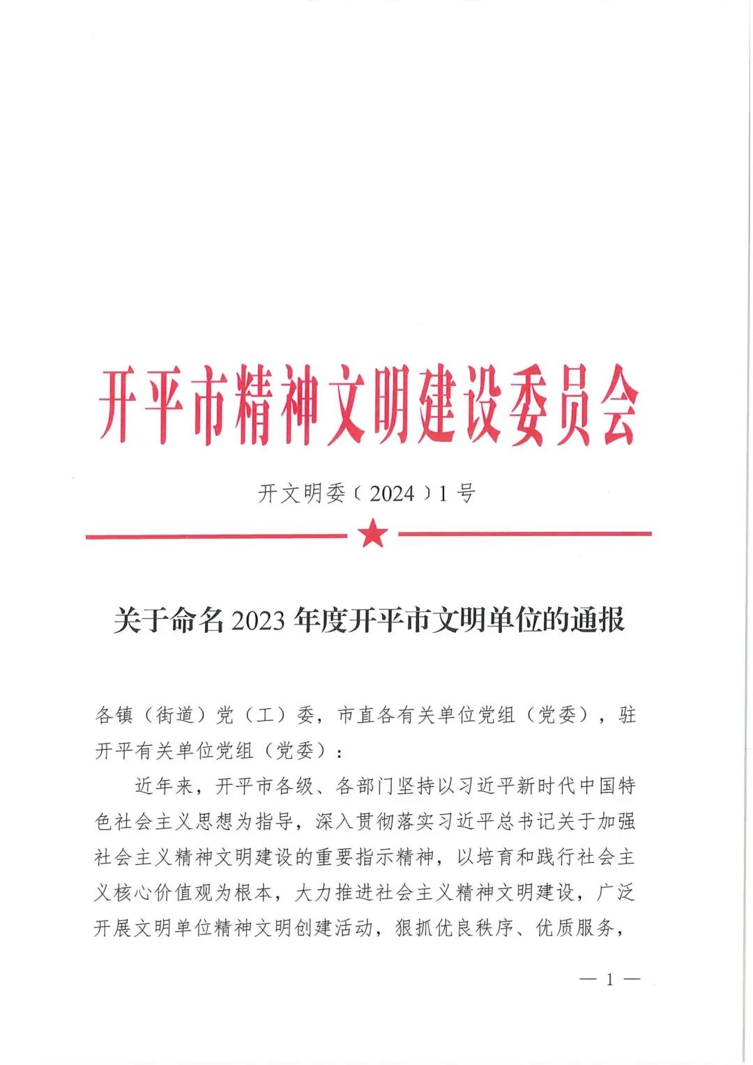 ,开平市精神文明建设委员会印发《关于命名2023年度开平市文明单位的通报》,其中,